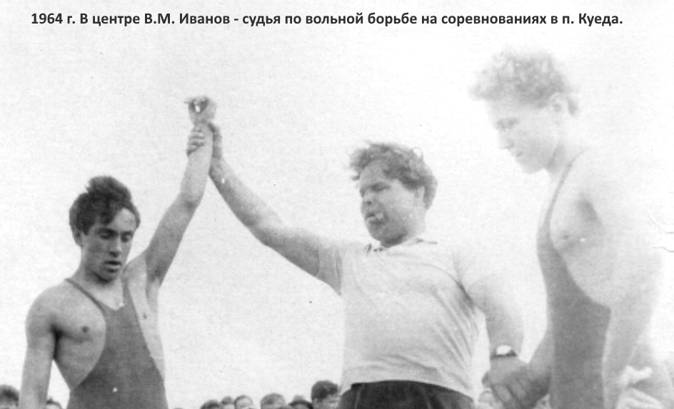 Работал помощником машиниста маневрового паровоза железнодорожной станции Куеда, затем председателем районного совета ДСО «Урожай». Доброе впечатление в нем производило все: очевидная сила тела и духа, добродушный вместе с тем характер и серебристый значок мастера спорта СССР на лацкане пиджака. Он был мастером спорта не только по борьбе самбо, но и по вольной борьбе. В свое время участвовал во многих республиканских и всесоюзных соревнованиях. Весть о том, что появился в поселке такой человек, быстро облетела всю округу, и по вечерам ребята, собираясь на стадионе, постоянно обсуждали эту тему. Стало известно это и Вячеславу Коновалову, который, после окончания школы работал инструктором районного совета ДСО «Урожай». Естественно, что он тут же встретился с В.М. Ивановым. Убеждать долго не пришлось, было принято решение организовать в Куеде секцию по борьбе самбо. В секцию к Валентину Михайловичу пришли те, кто уже занимался каким – либо видом спорта, – лыжники, легкоатлеты, волейболисты. Первыми были Ю. Щипицин, Р. Сафин, Н. Дягтев, Н. Гиляровский, Г. Красноперов, В. Коновалов и другие. Помещения не было. Первые занятия В.М. Иванова по самбо проходили на сцене дома культуры, а летом вообще на улице: была вырыта яма, наполненная опилками и накрытая брезентом. Затем занятия проходили в небольшом спортивном зале восьмилетней школы на гимнастических матах, покрытых матерчатым пологом. Позднее Валентин Михайлович сумел раздобыть борцовский ковер. О секции самбо заговорили буквально через год – два, когда лучшим воспитанникам Иванова была присвоена квалификация второго и первого спортивного разрядов. Через некоторое время В.М. Иванов по личным обстоятельствам уезжает в Краснодарский край. Его дело продолжает один из лучших воспитанников Вячеслав Коновалов.