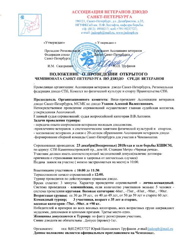 23.12.2018: О проведении Открытого чемпионата С-Петербурга по дзюдо среди ветеранов. Положение можно скачать ЗДЕСЬ.