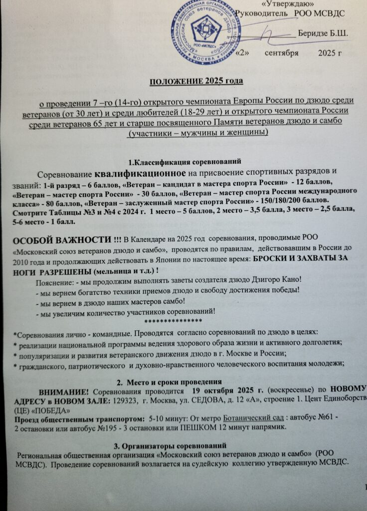 о проведении 7 –го (14-го) открытого чемпионата Европы России по дзюдо среди ветеранов (от 30 лет) и среди любителей (18-29 лет) и открытого чемпионата России среди ветеранов 65 лет и старше посвященного Памяти ветеранов дзюдо и самбо